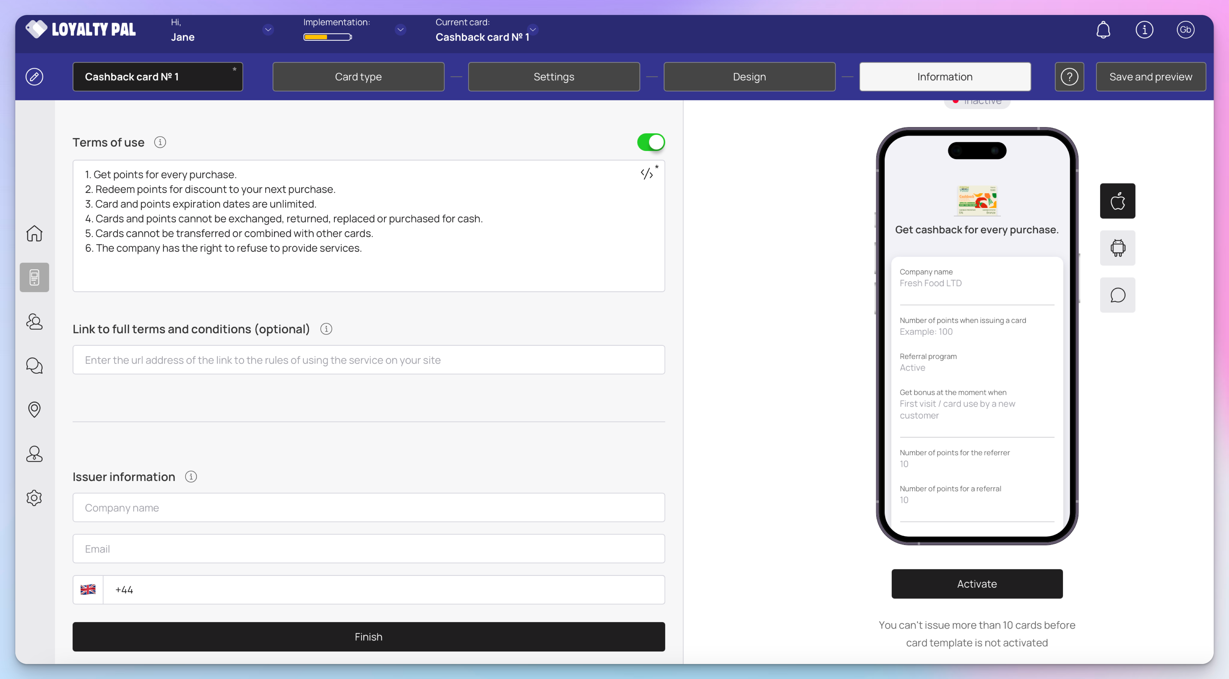 Terms of use: In case you want to include Terms of use on the card, enable the toggle button next to Terms of use heading. Here you can enter the rules for your card.