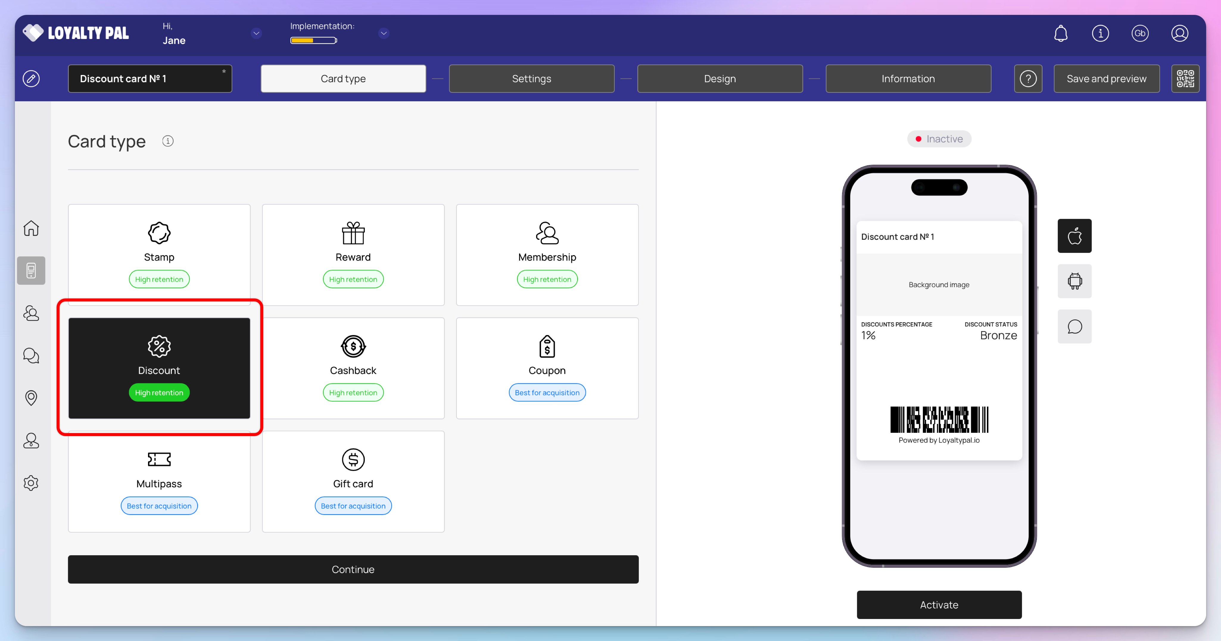 This section lets you configure the design of the discount card. Let's get creative!