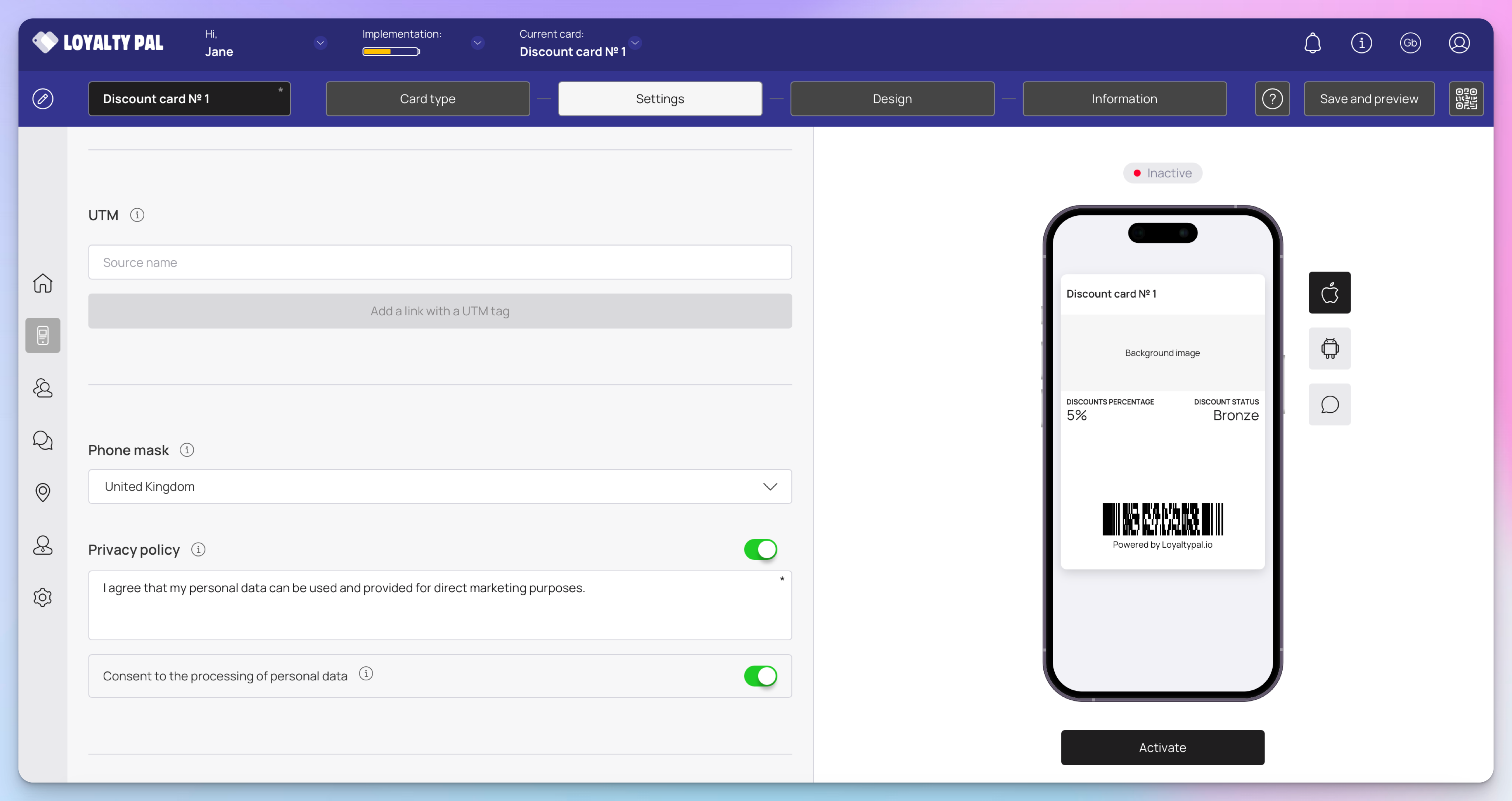 UTM: Here, you can create a channel link for the analytics to be tracked of the traffic generated by that channel. For instance, if you add Facebook in this field, LoyaltyPal will generate a URL automatically associated to a UTM tag. Great for tracking where your customers download your loyalty card from. This can be used for both online and offline.