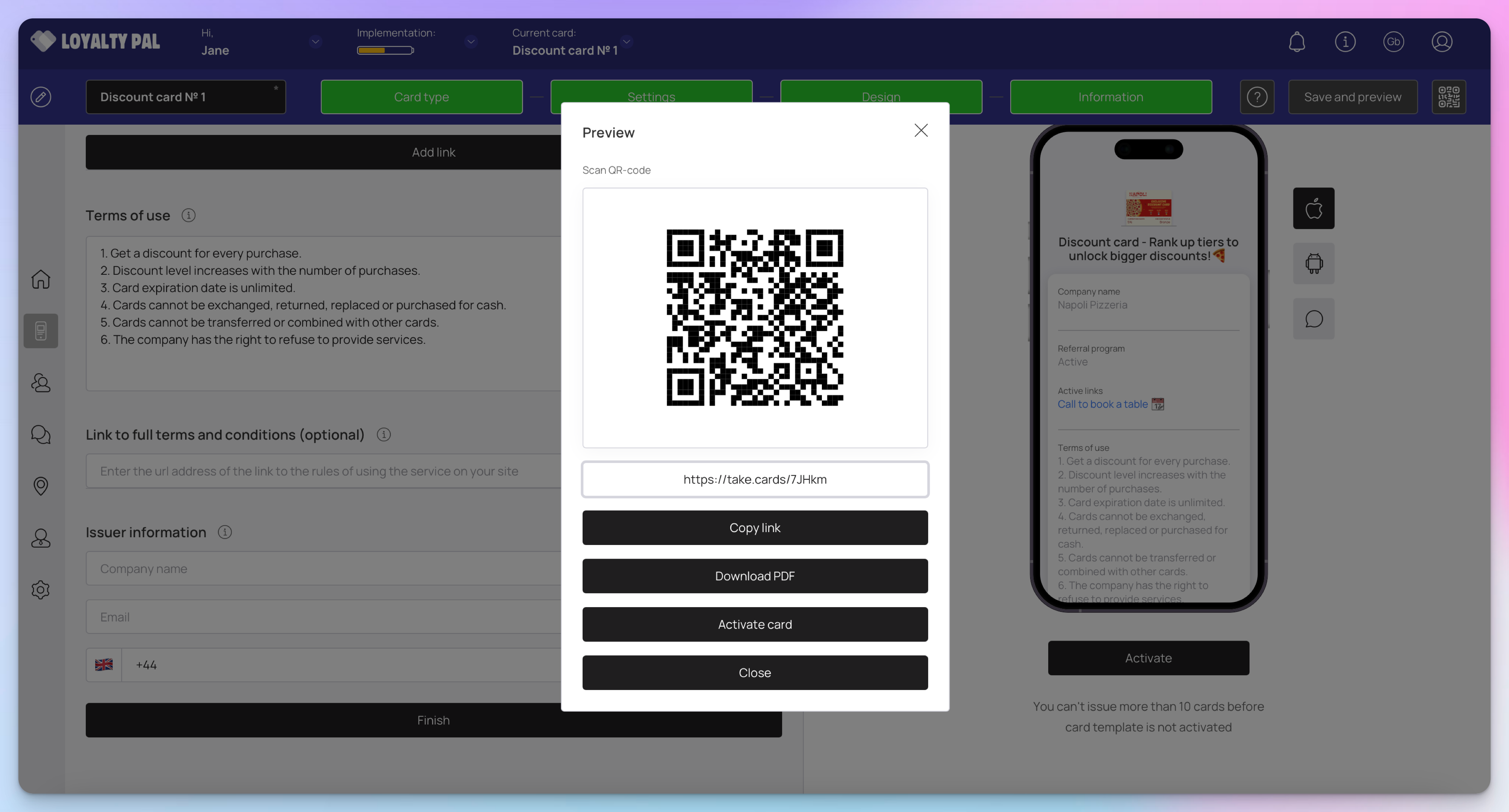 Your card is ready to be previewed, scan the QR code/copy link to your mobile device to preview and test the card.