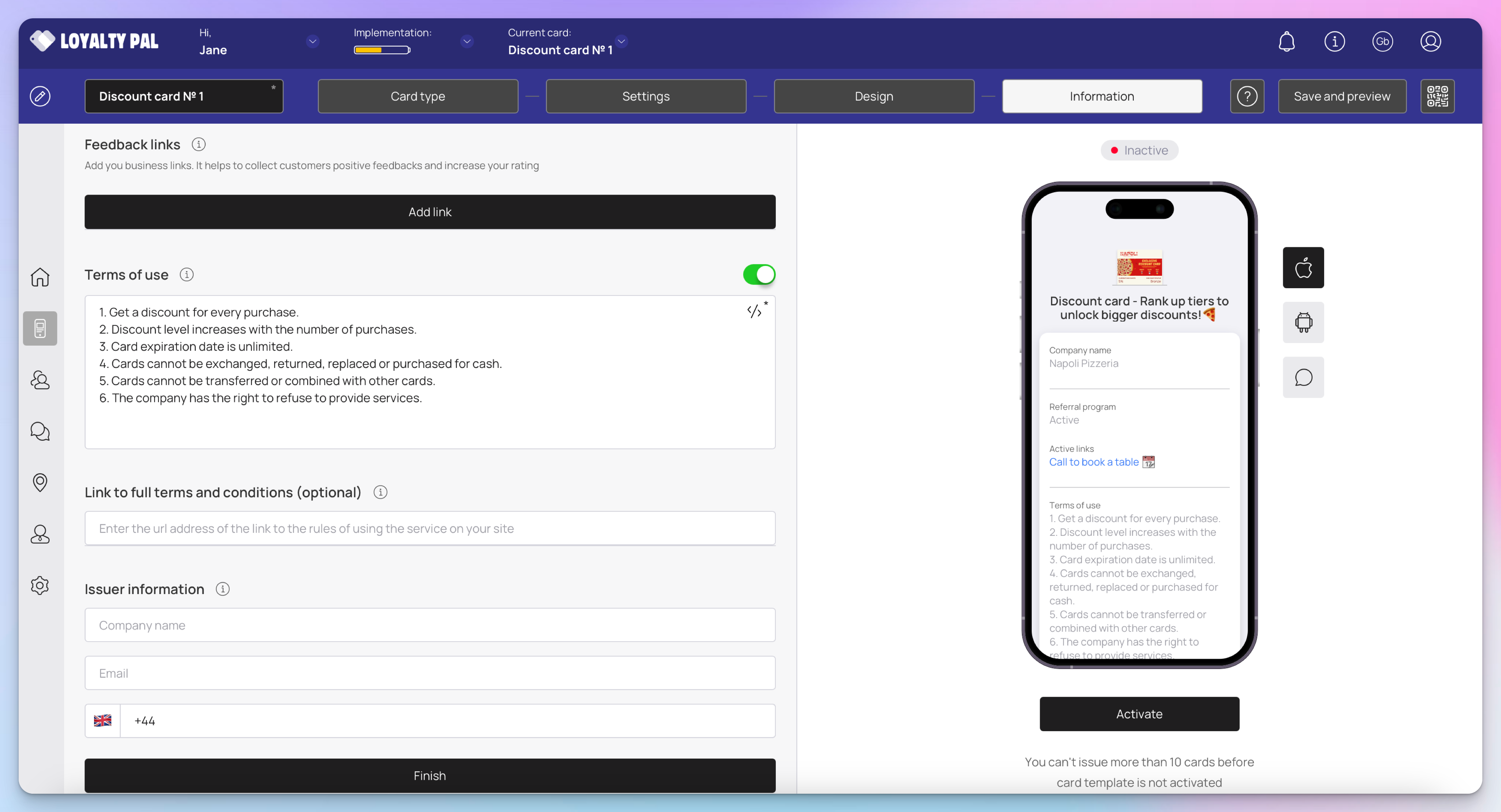 Terms of use: In case you want to include Terms of use on the card, enable the toggle button next to Terms of use heading. Here you can enter the rules for your card.