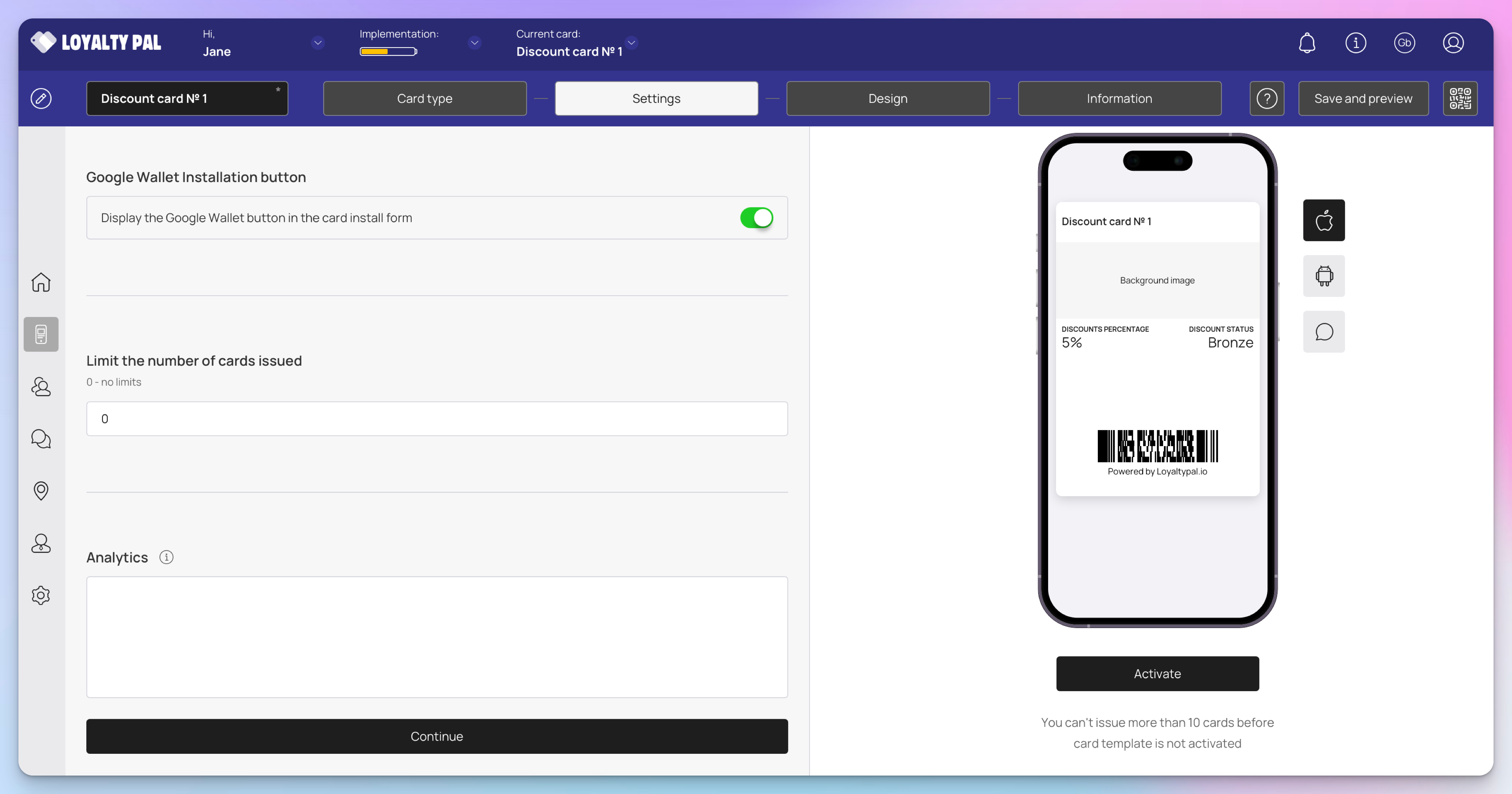 Once you're happy with the card you must activate it. You can issue 10 cards before the card will need to be activated.