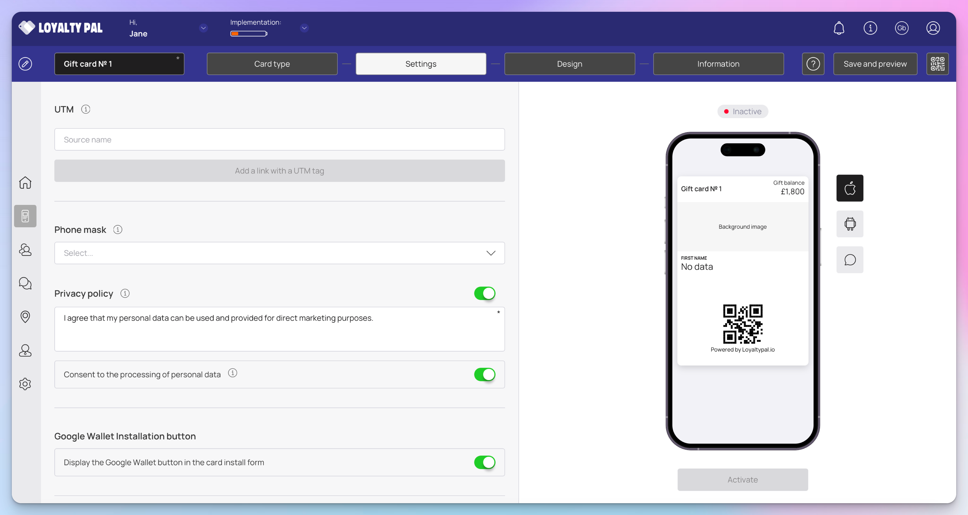 Google Wallet installation button: (Recommended to keep enabled) Option to disable customers adding the card to Google Wallet