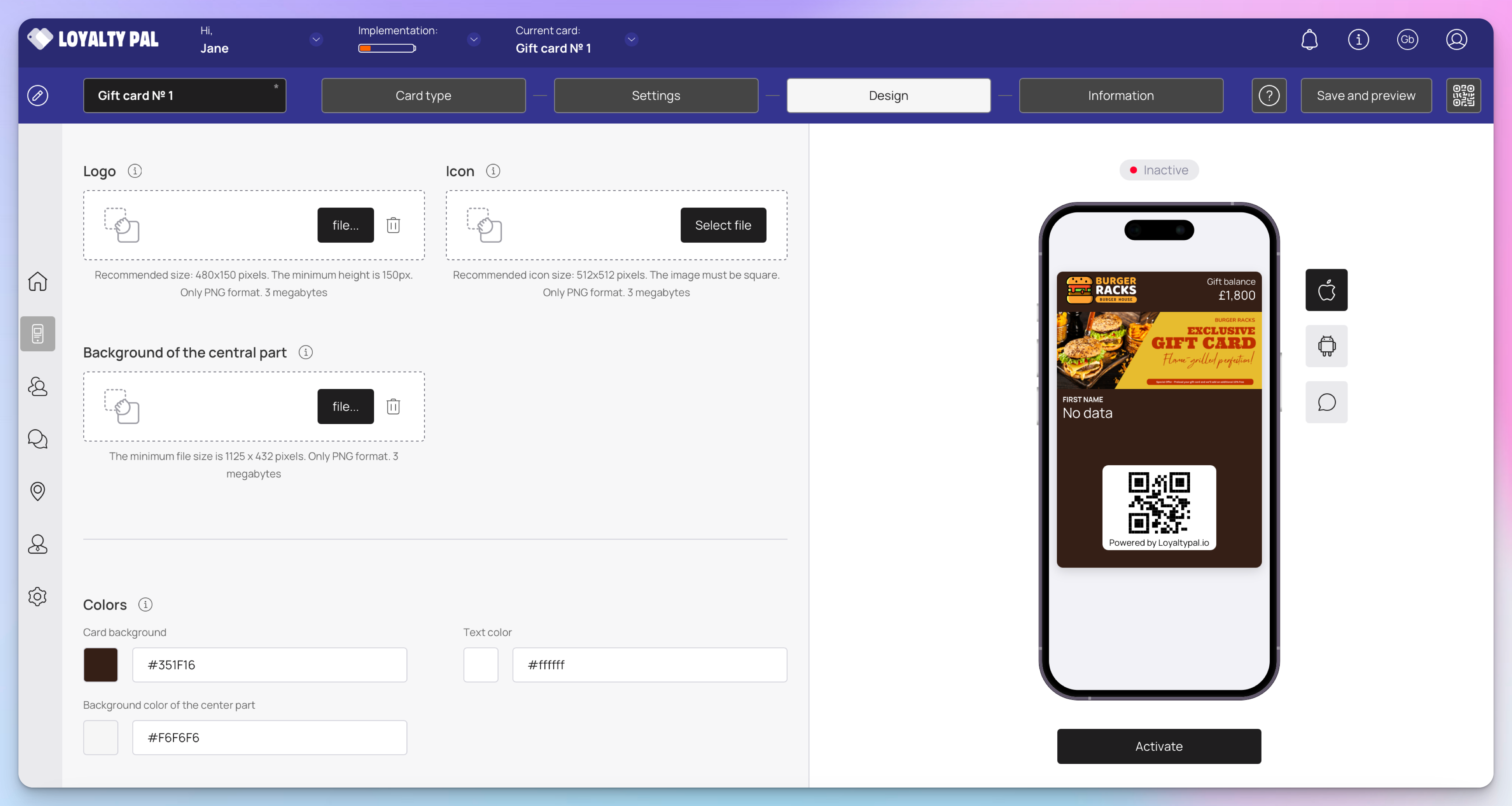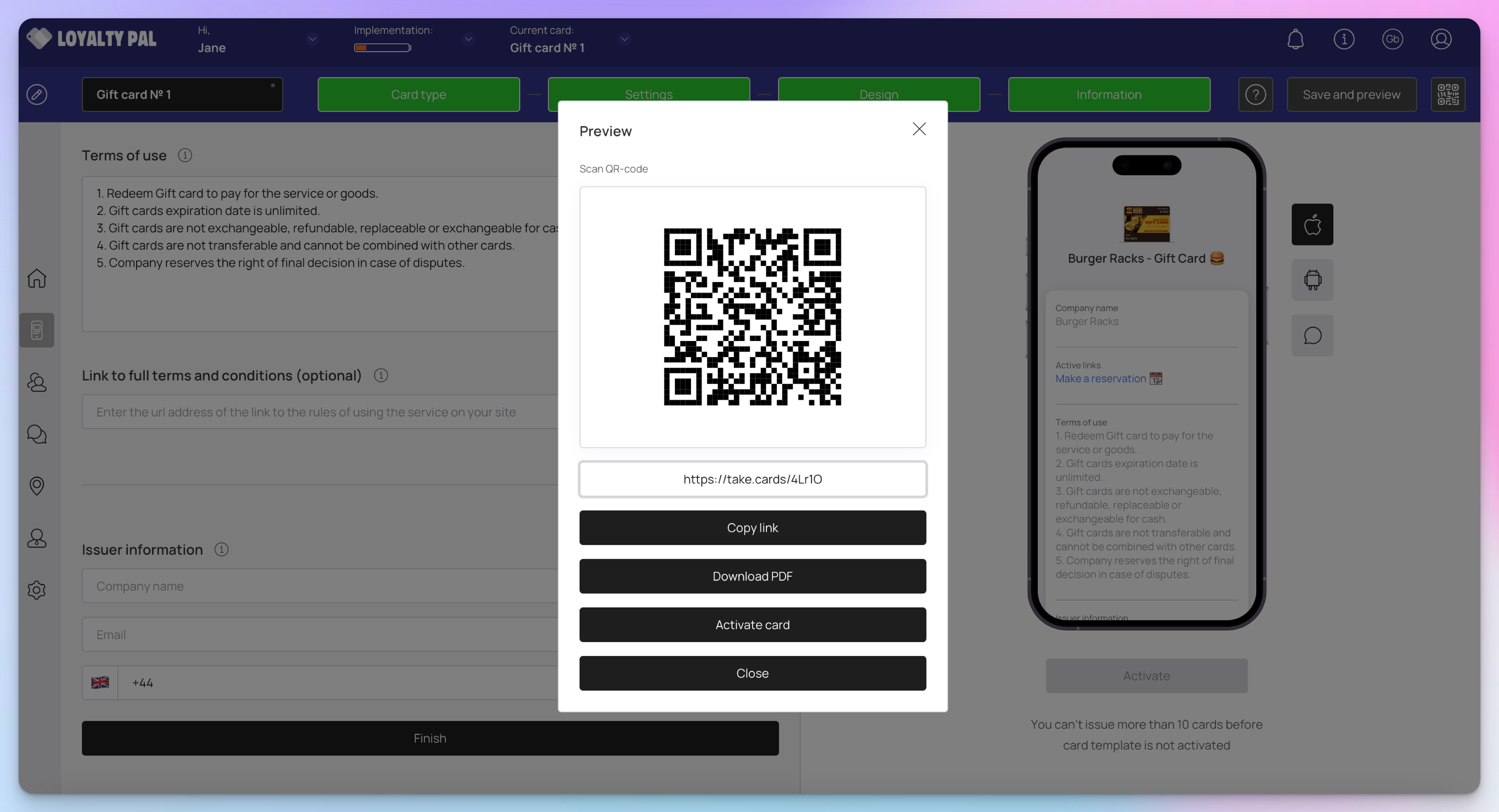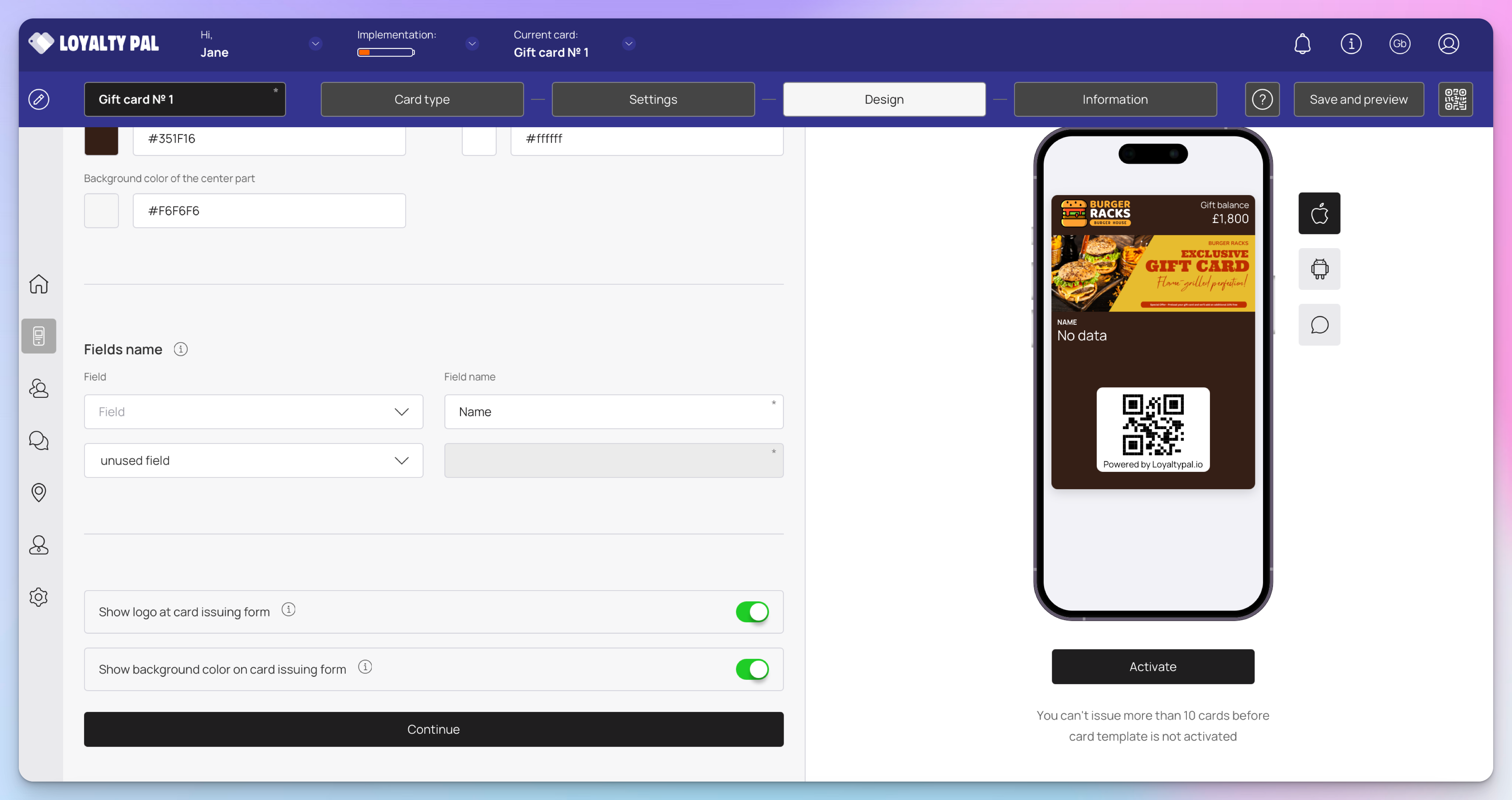 Once you're happy with the card you must activate it. You can issue 10 cards before the card will need to be activated.