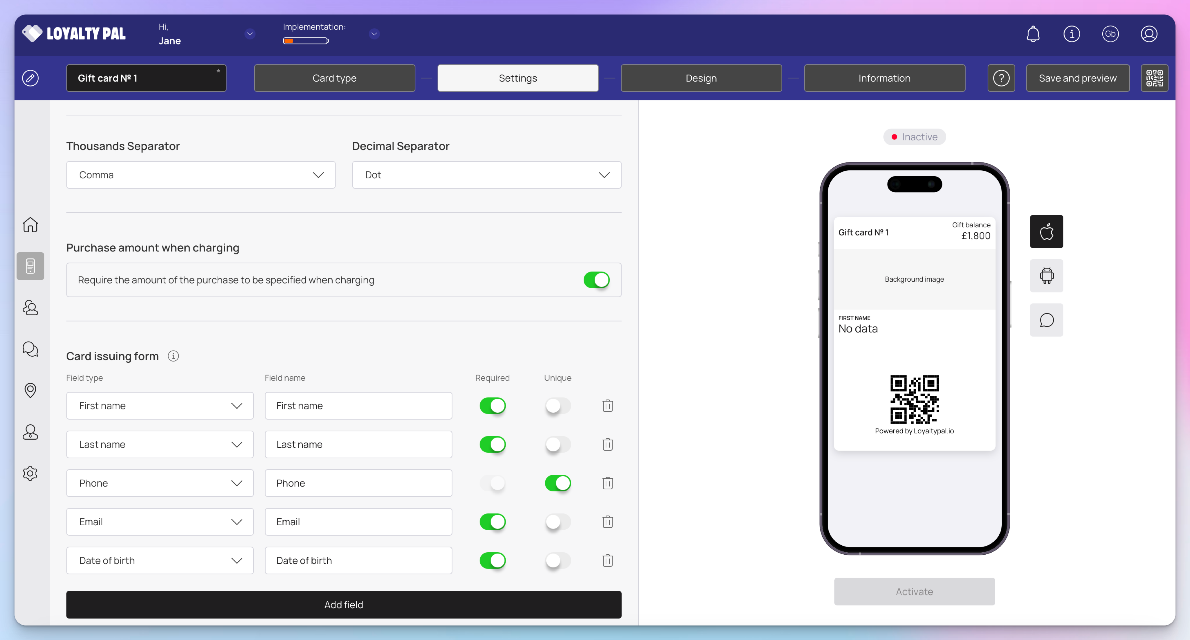 Card issuing form: Here, you can define the fields you want to include on the reward card registration page for customers. You can keep the default or add fields to collect custom data from customers. We recommend keeping this to a minimum to keep customer sign up quick. In case you want to make a field mandatory, enable the Required toggle. Similarly, if you want to record unique data in a field, enable the Unique toggle.