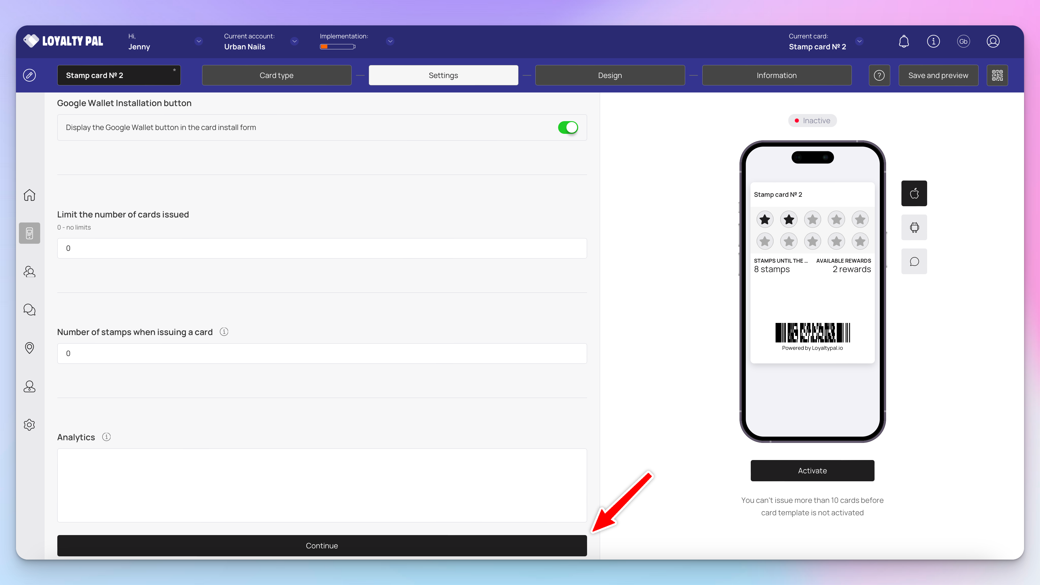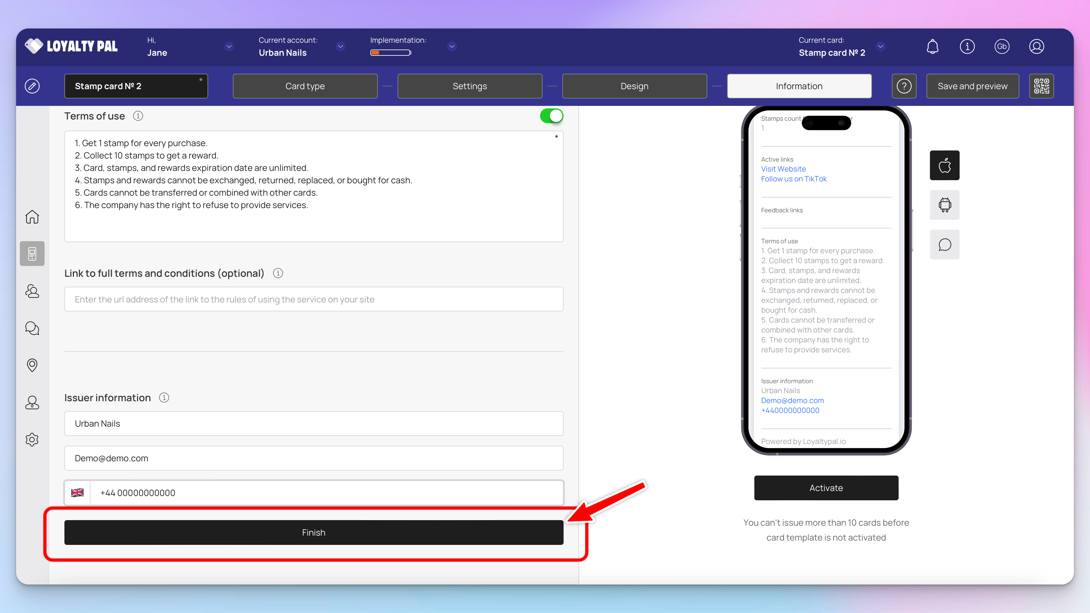 Once you're happy with the card you must activate it. You can issue 10 cards before the card will need to be activated.