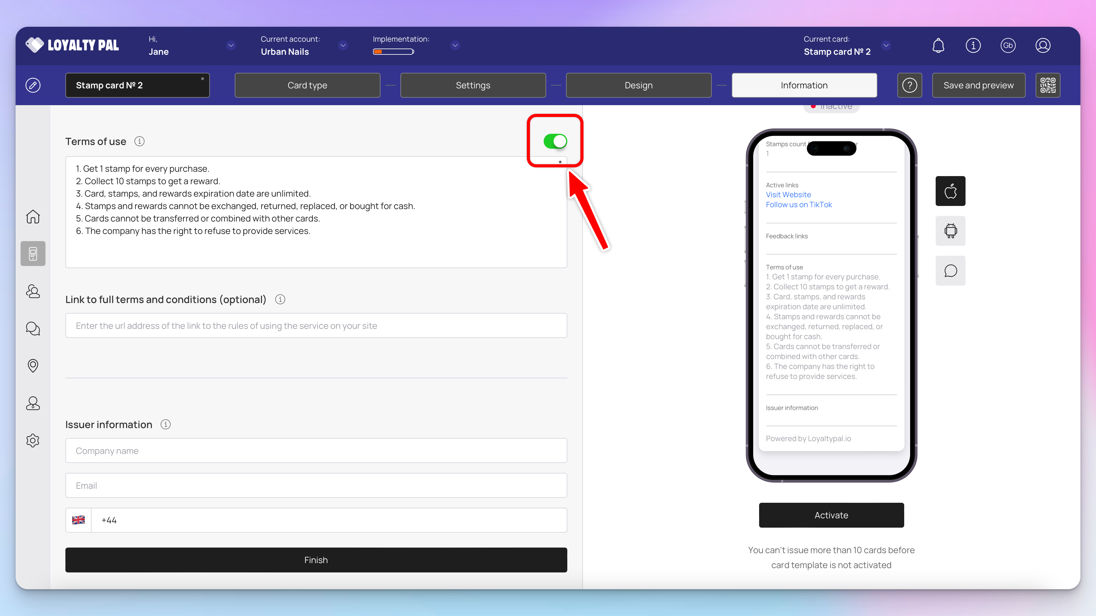 In case you want to include Terms of use on the card, enable the toggle button next to Terms of use heading. Here you can enter the rules for your card.