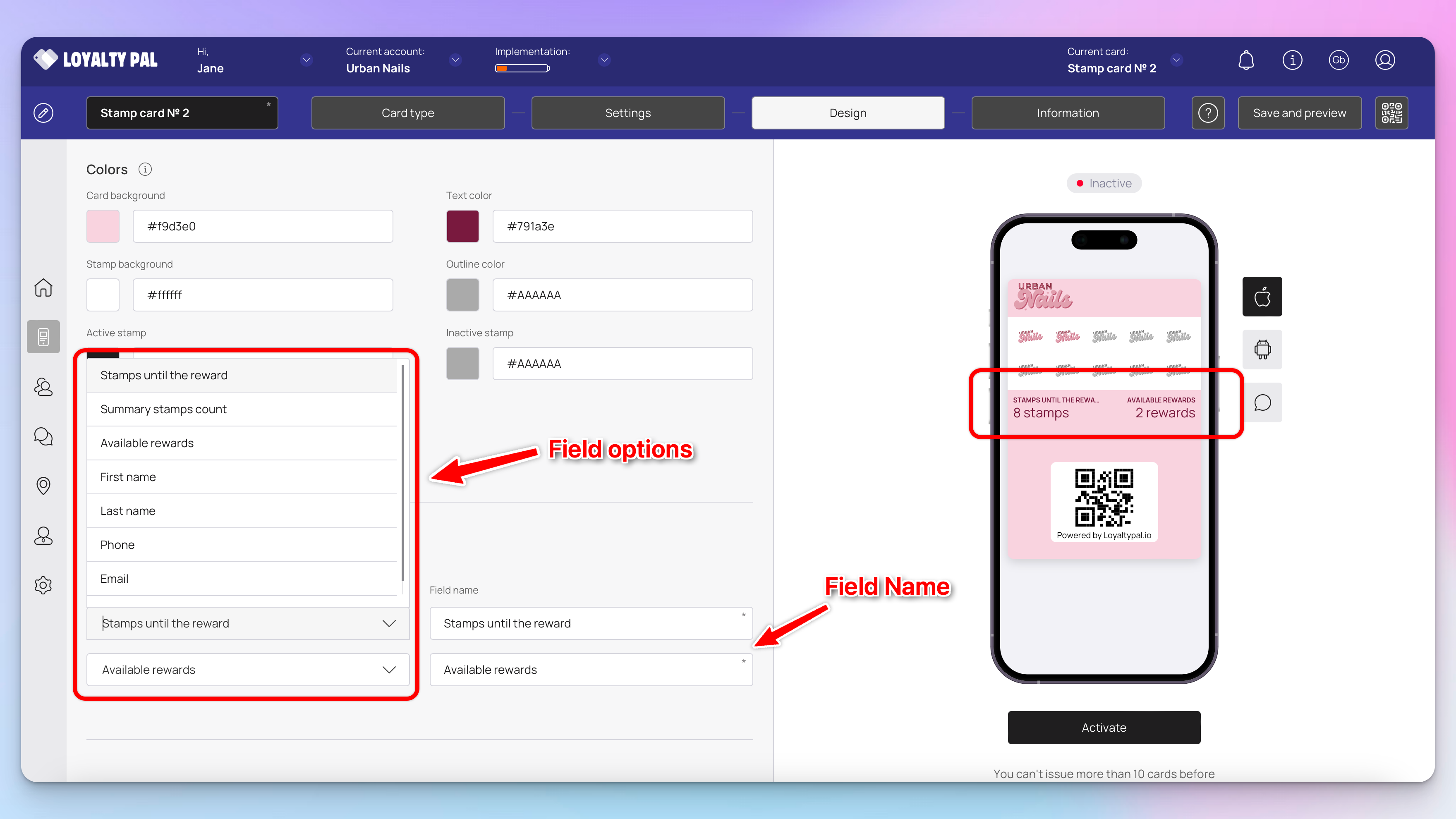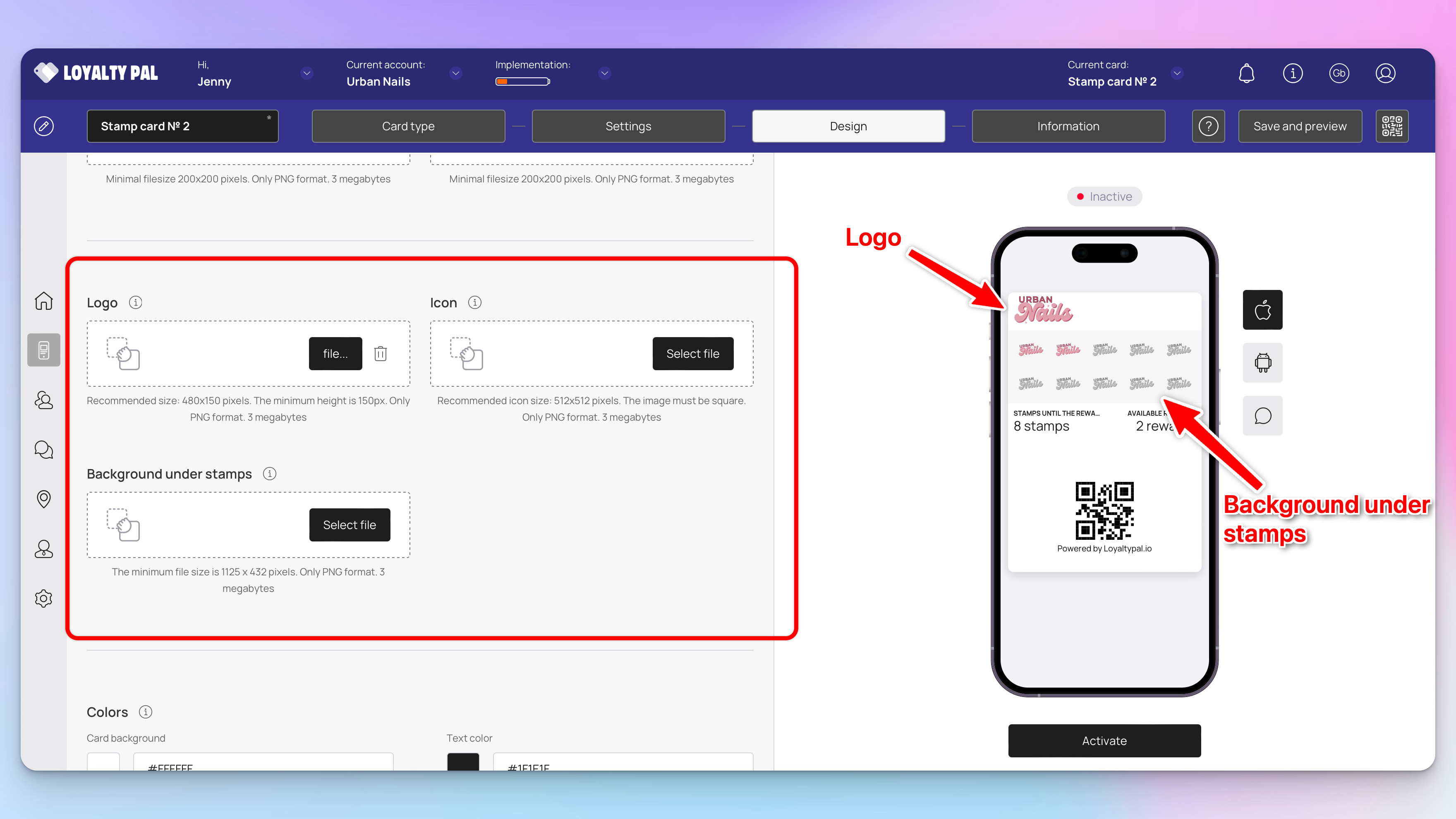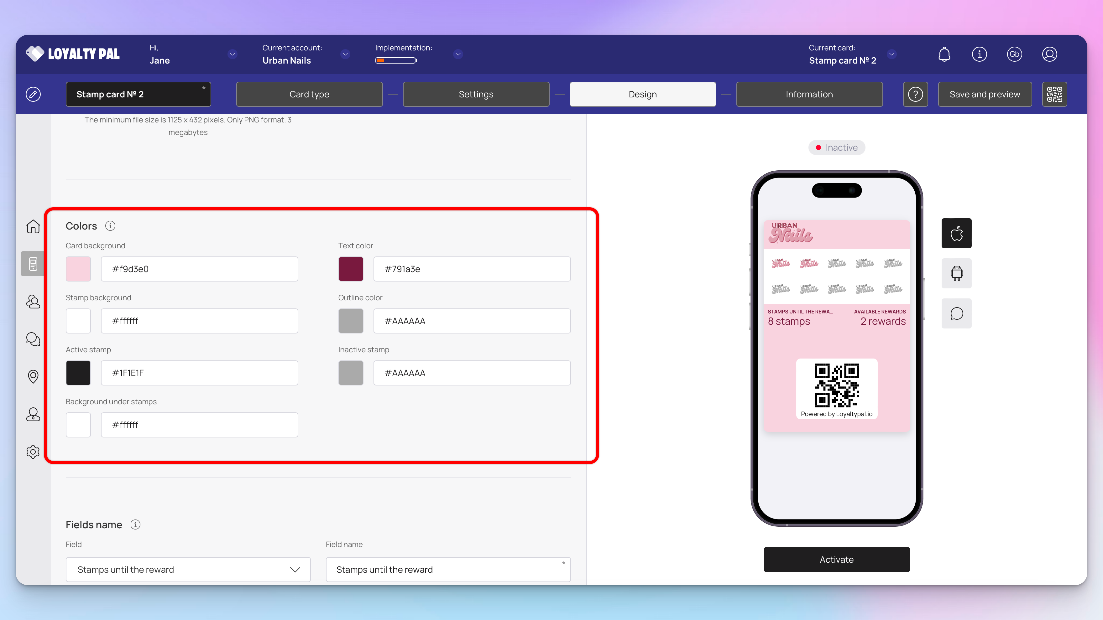 From the Colours section, you can set the colours for Card Background, Text Colour, Stamp Background, Outline Colour, Active Stamp, Inactive Stamp, and Background under stamp.
