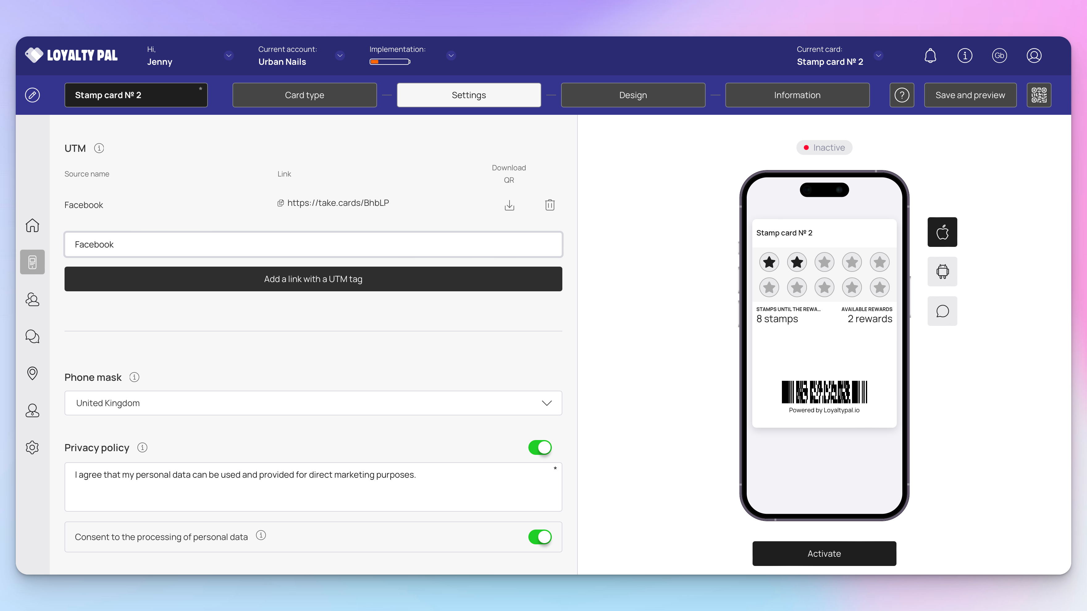 UTM: Here, you can create a channel link for the analytics to be tracked of the traffic generated by that channel. For instance, if you add Facebook in this field, LoyaltyPal will generate a URL automatically associated to a UTM tag. Great for tracking where your customers download your loyalty card from.