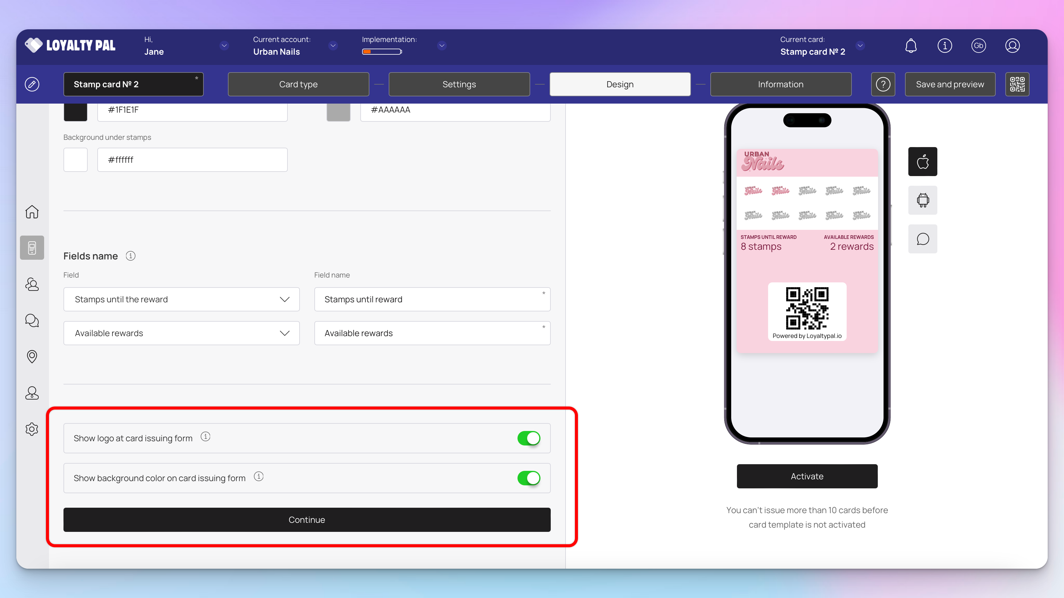 Similarly, enable the 'Show background colour on card issuing form' toggle button in case you want the background colour to appear on the card issuing form.