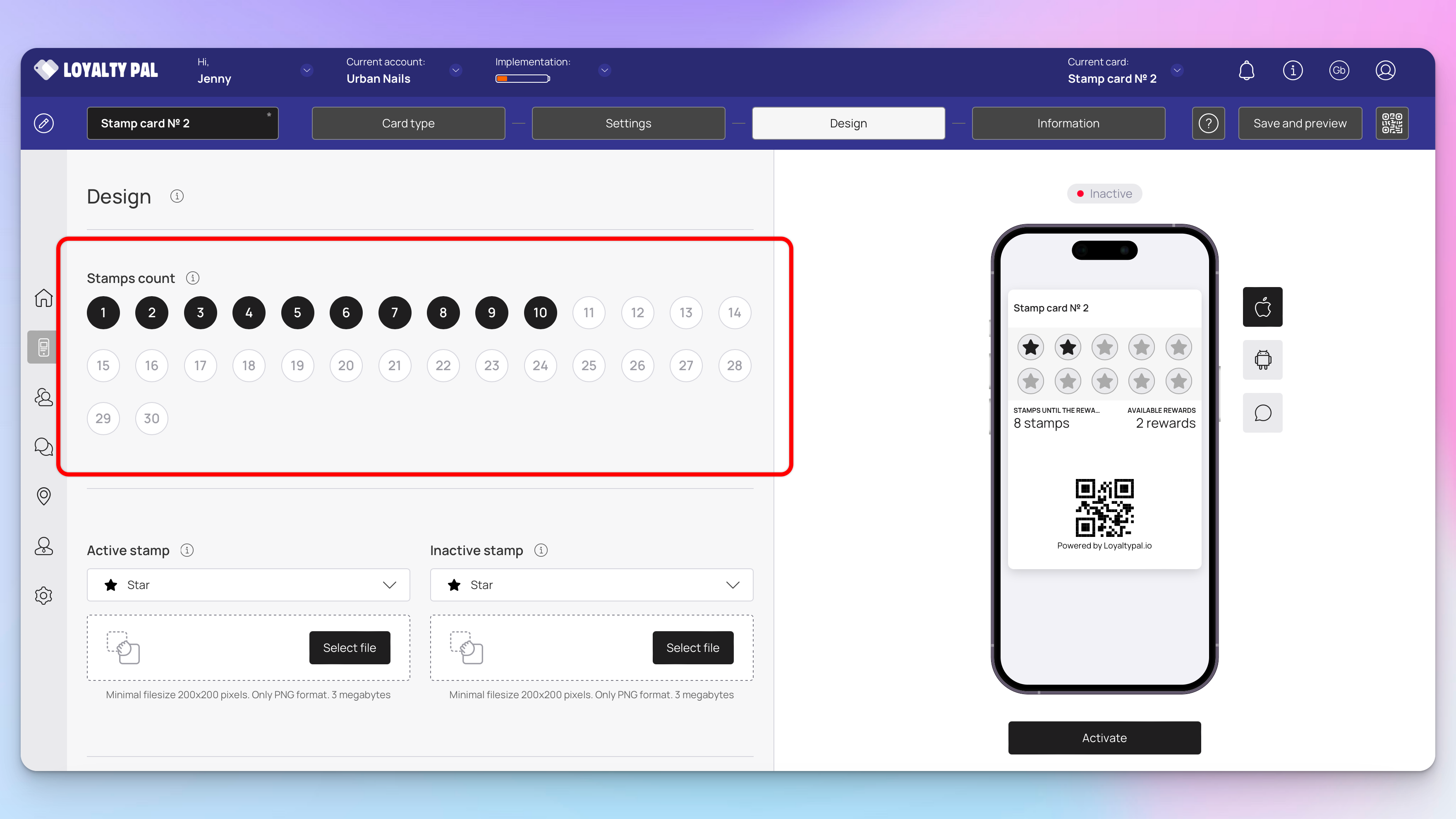 Stamp count: Choose the number of stamps between 1 - 30 at which the reward can be redeemed.