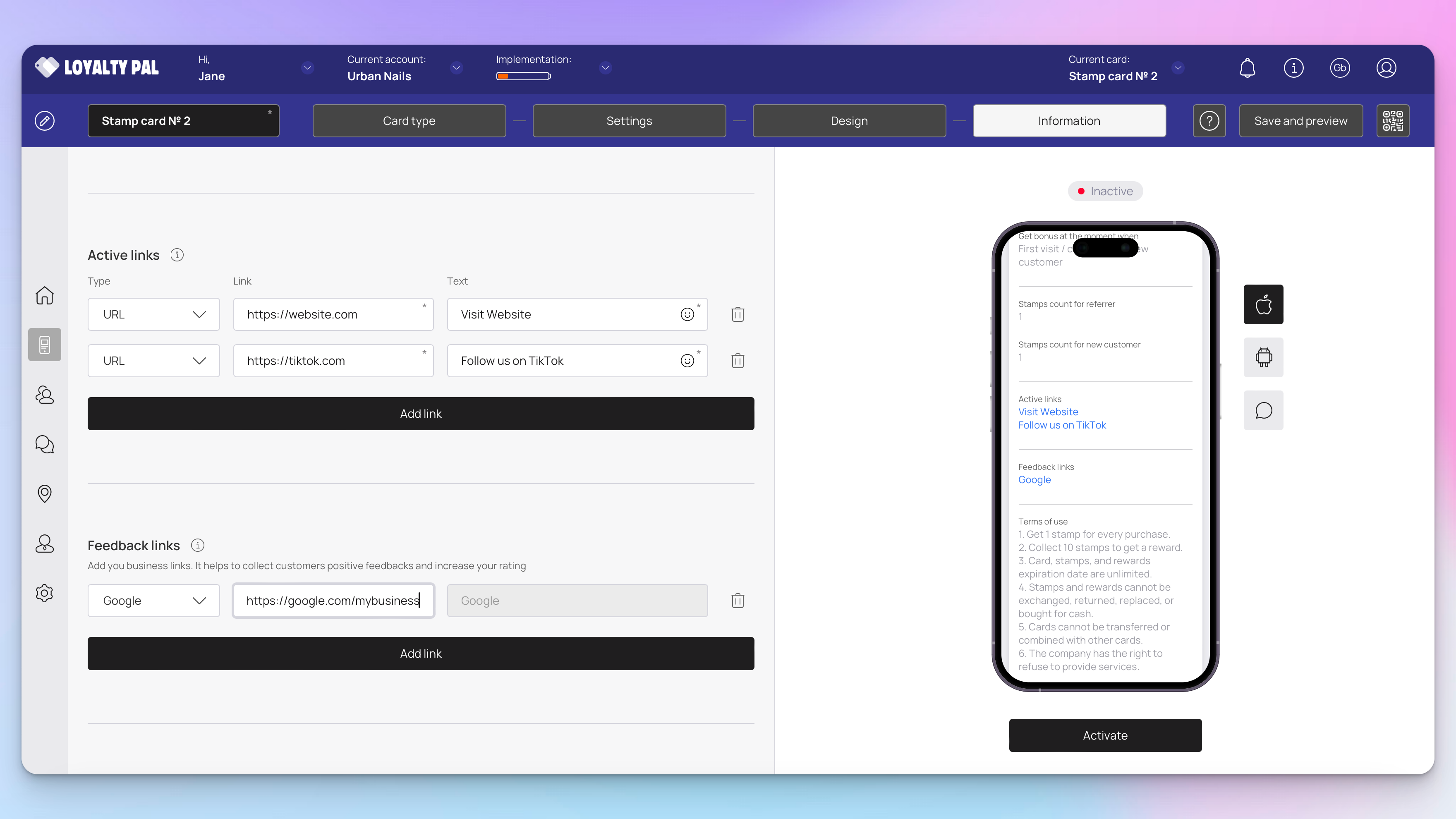 Feedback links: Similarly, use the link type dropdown and link fields under the Feedback Links heading to add your business links for the customer reviews to be recorded.