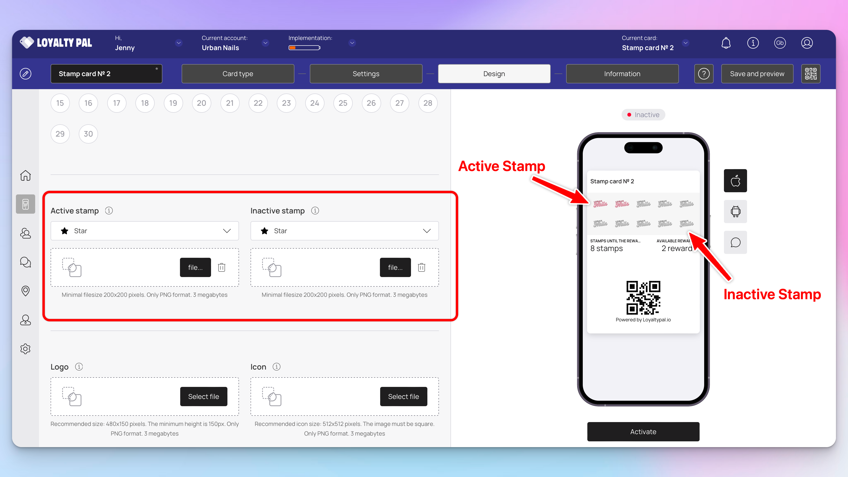 Active stamp: This will show when a customer has earned the stamp. (The example shows the companies logo in colour)