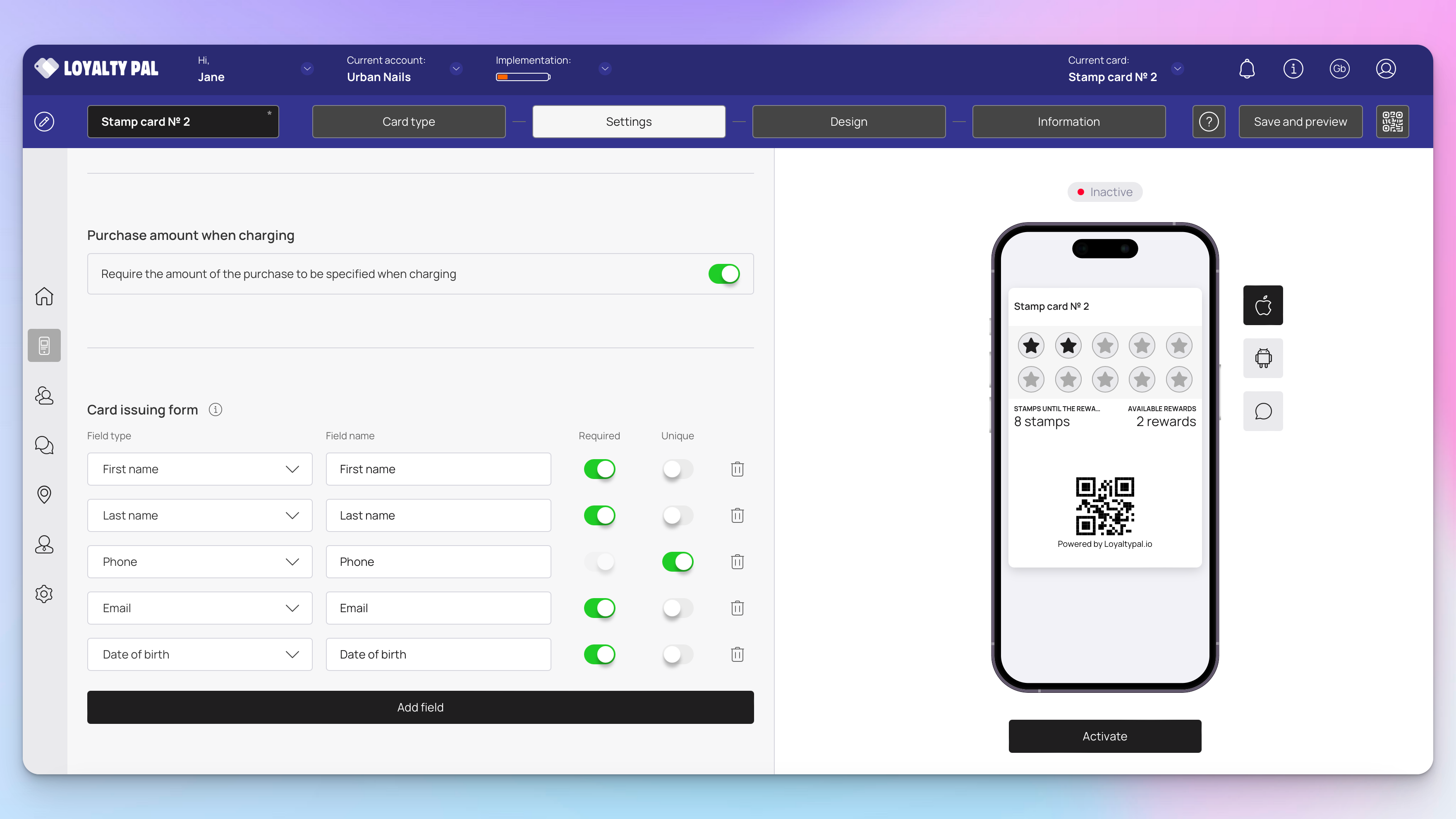 Card issuing form: Here, you can define the fields you want to include on the stamp card registration page for customers. You can keep the default or add fields to collect custom data from customers. We recommend keeping this to a minimum to keep customer sign up quick. In case you want to make a field mandatory, enable the Required toggle. Similarly, if you want to record unique data in a field, enable the Unique toggle.