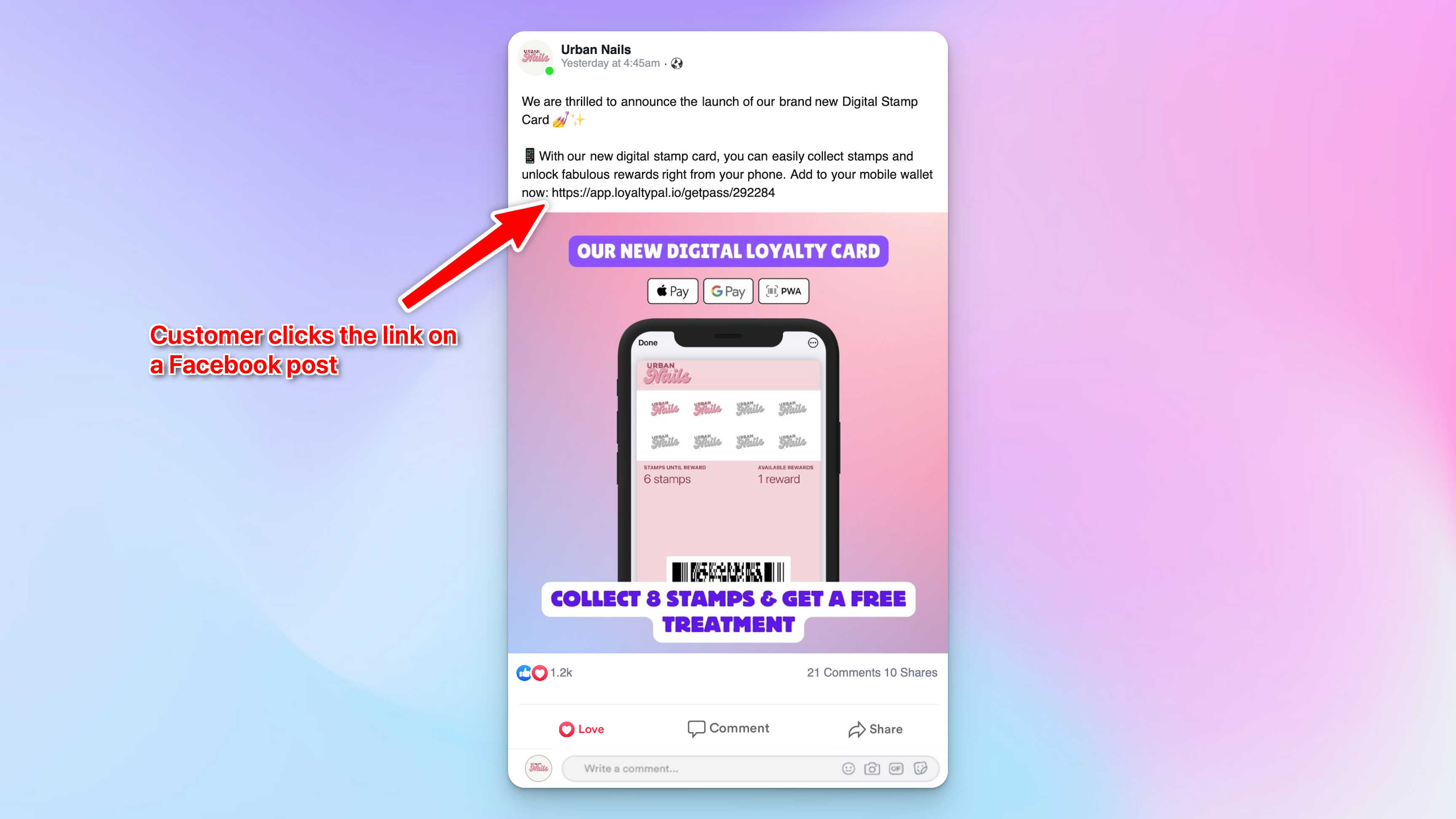 You can distribute your loyalty cards both online and offline for this guide will be demonstration an online method via a social media post. Learn how to distribute cards here.
