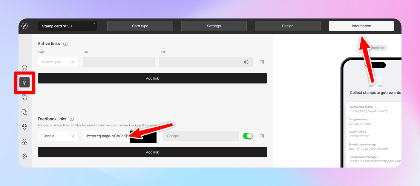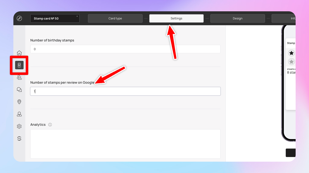 Now go to the card template settings and enter how many points/stamps you want to give your customers for a Google review.