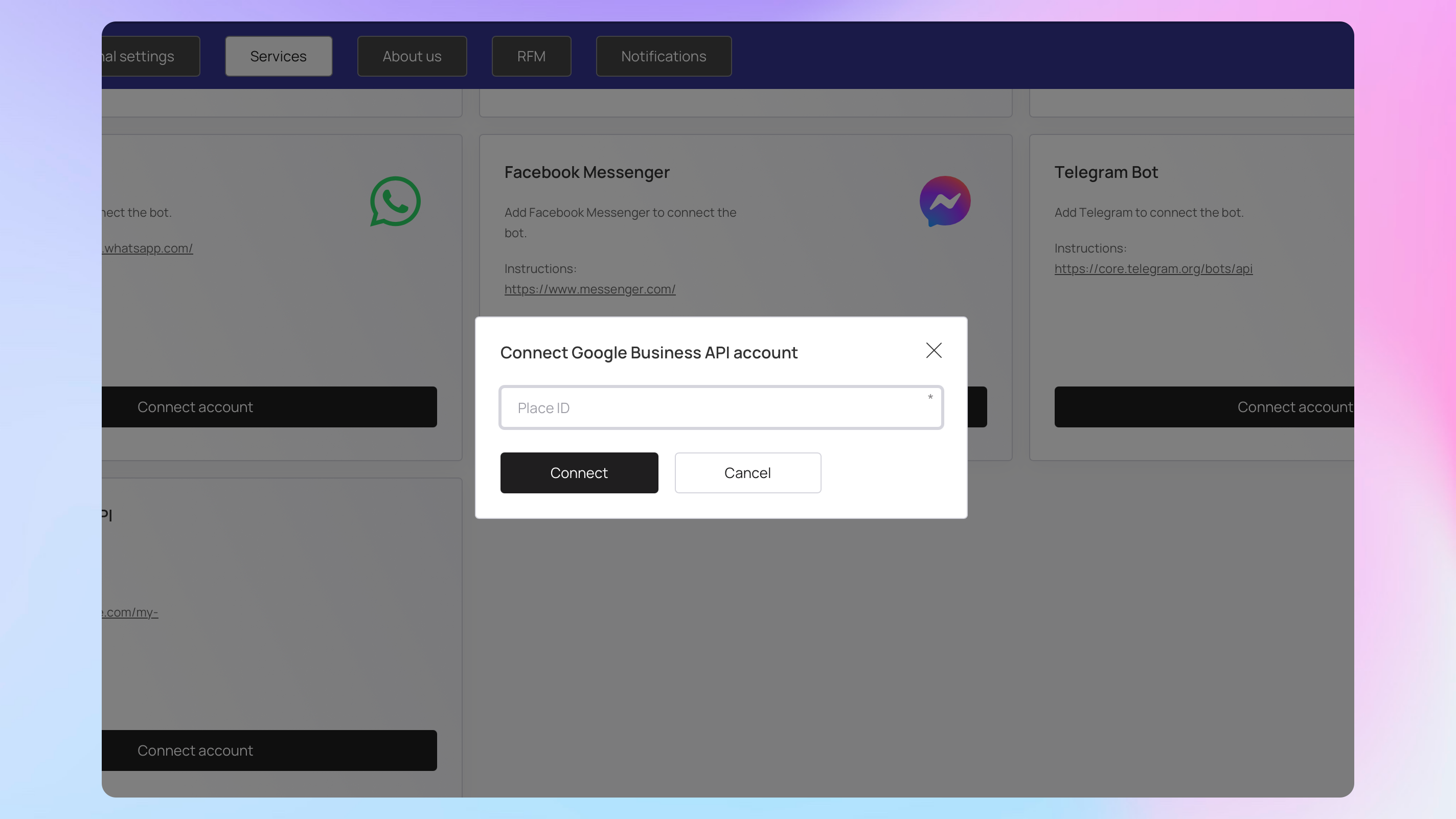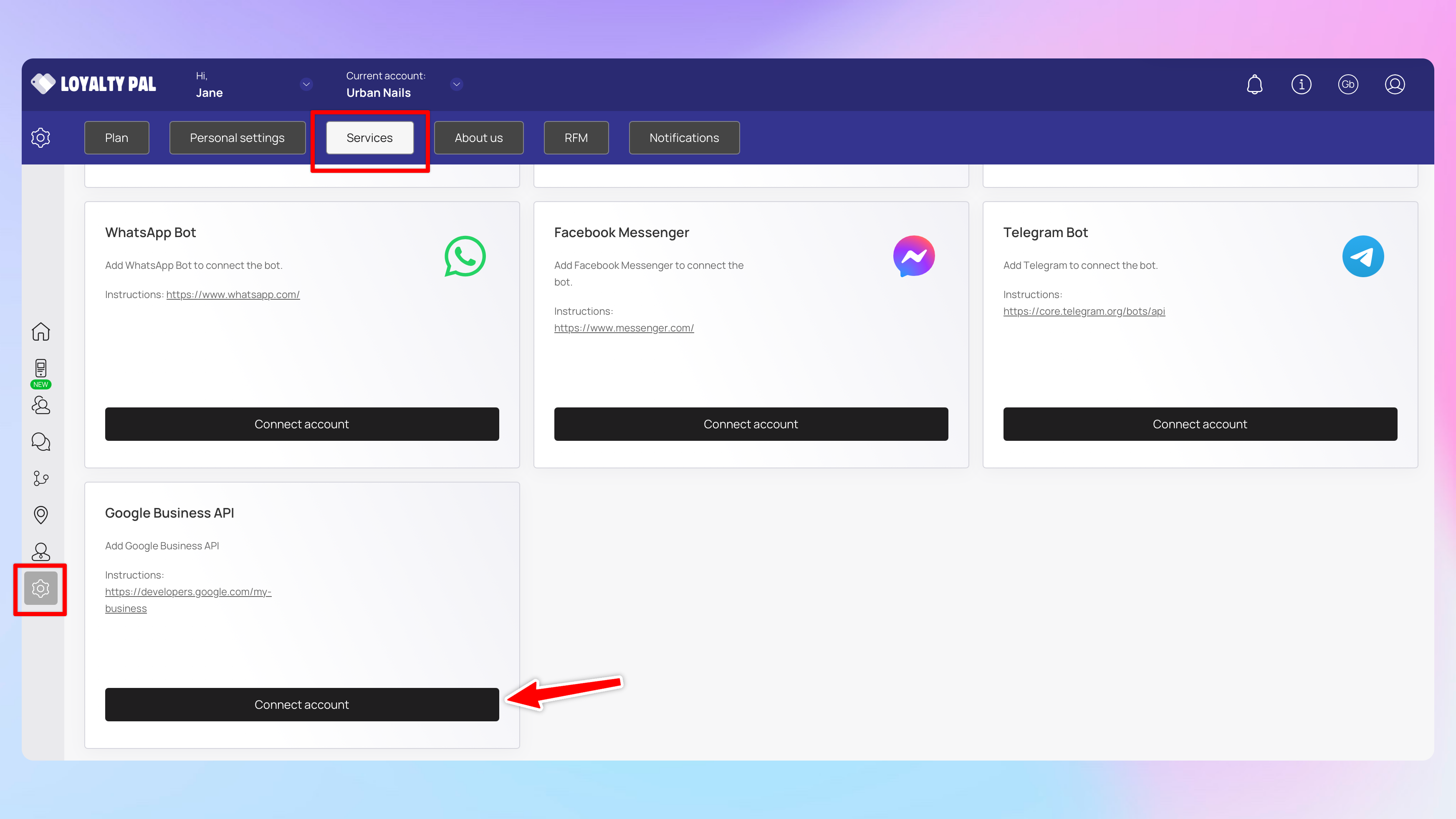 Go to your LoyaltyPal account settings, click services then click on 'Connect account' in the Google Business API section.