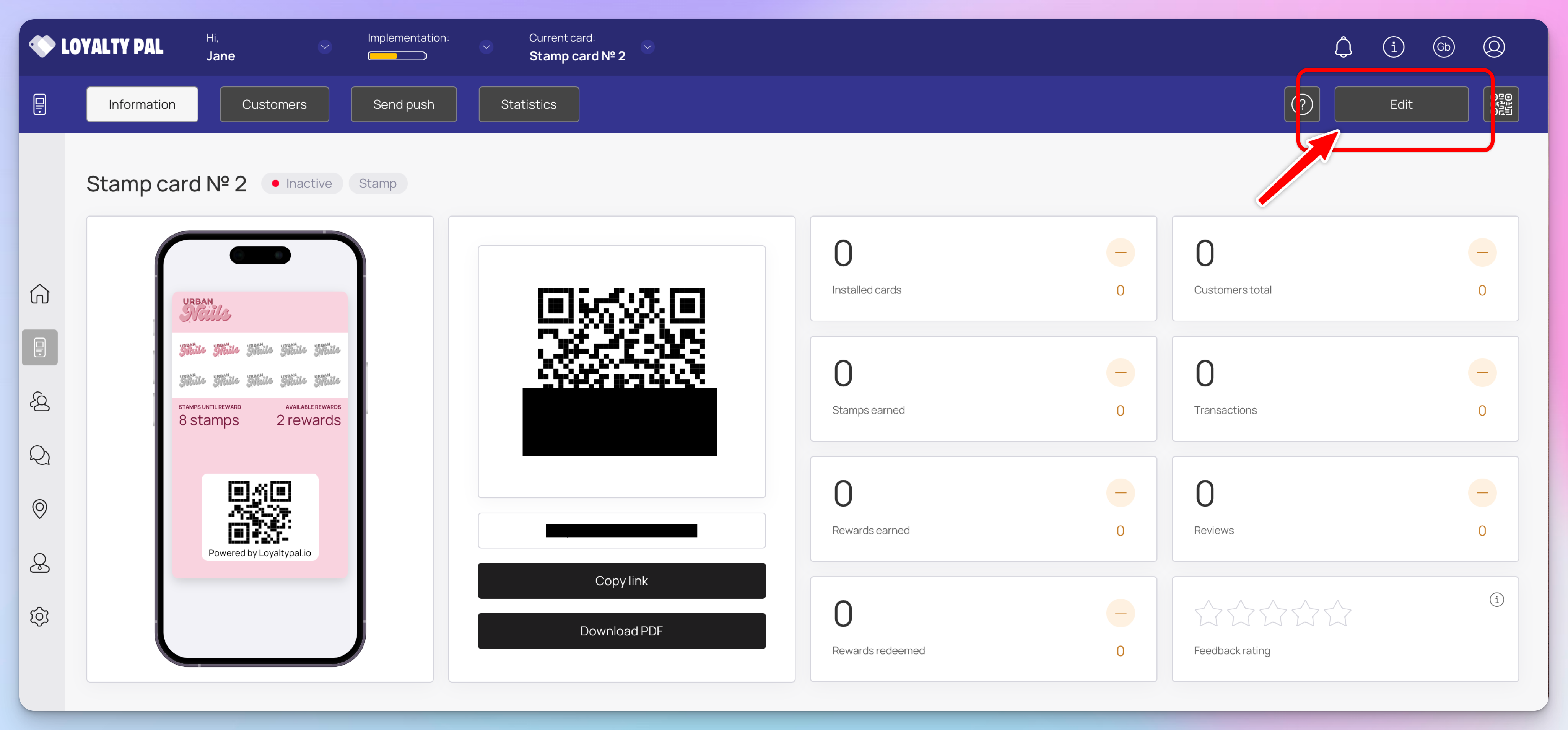 To activate the referral program, click 'Edit' on the card of your choice. If you don't have any cards yet, be sure to explore our detailed card creation guides for each card type, which also includes instructions on setting up the referral program specific for each card type.