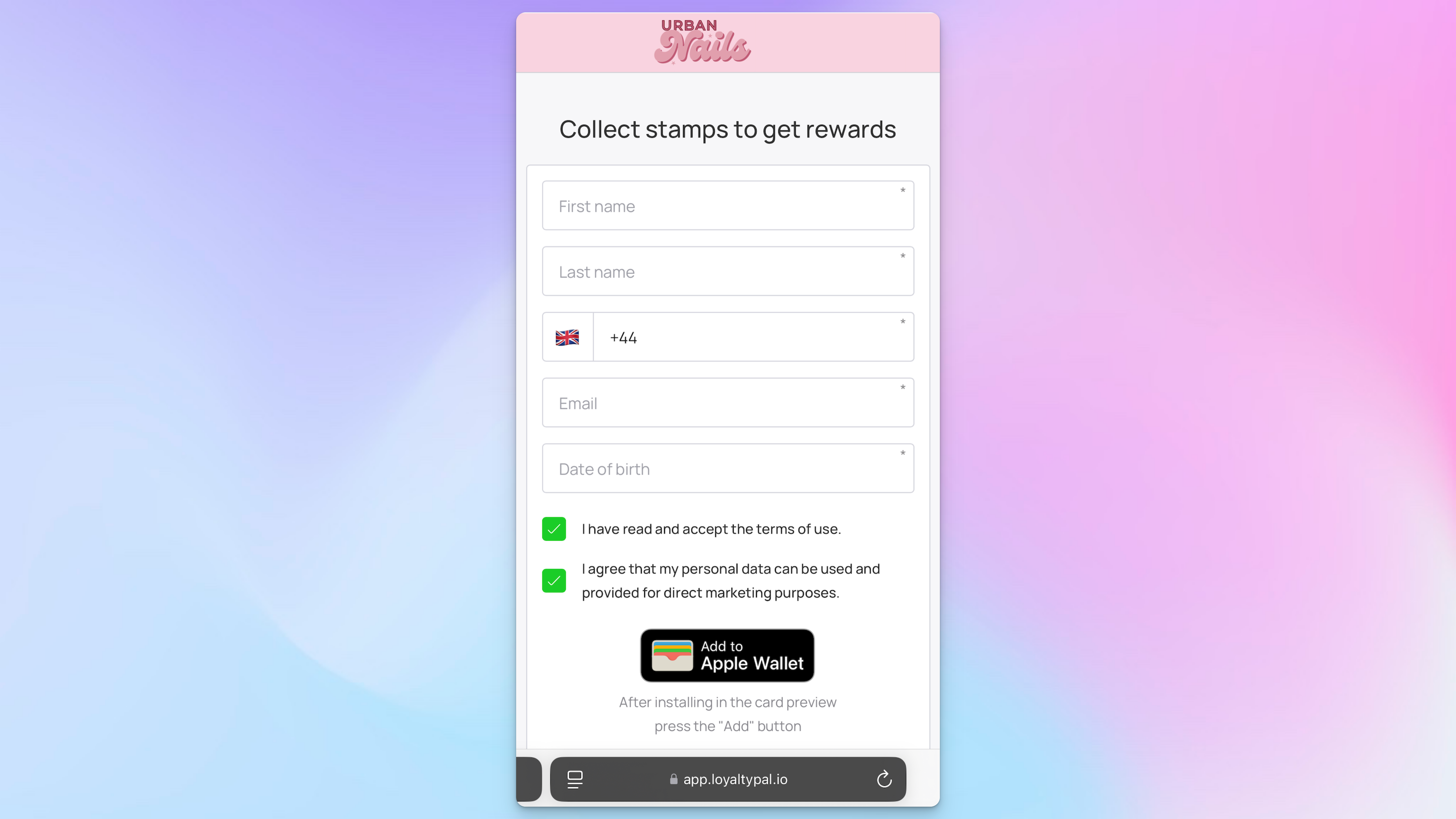 The link will open the card installation page. The new customer will then be able to install the card and the bonus points/stamps will be rewarded either straight away or once the new customer has made a purchase depending on the card settings.