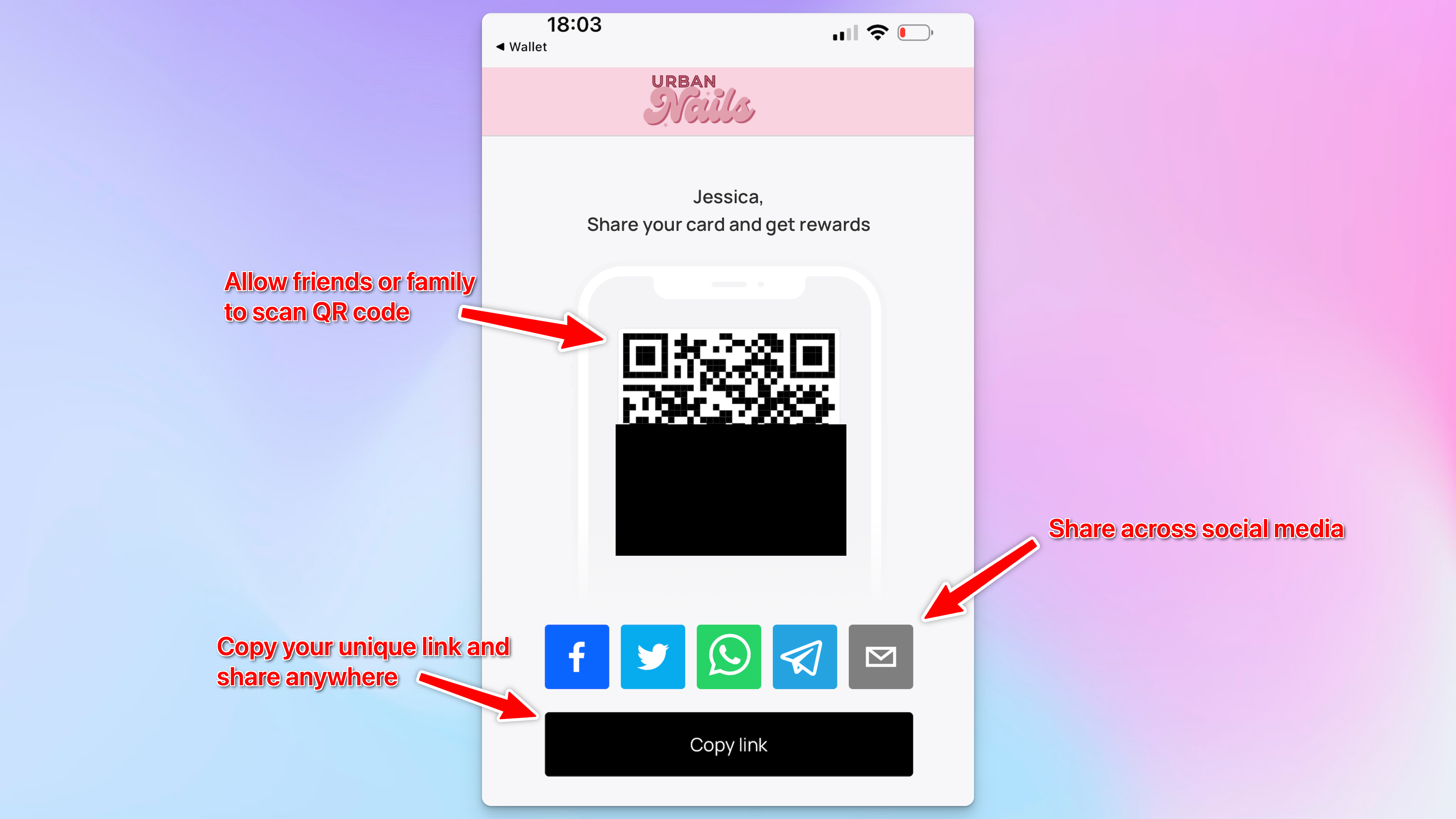 Earning referral bonuses is easy for customers. In this example, we'll focus on a card installed in the Apple Wallet, but the process is the same on Android devices & PWA cards.