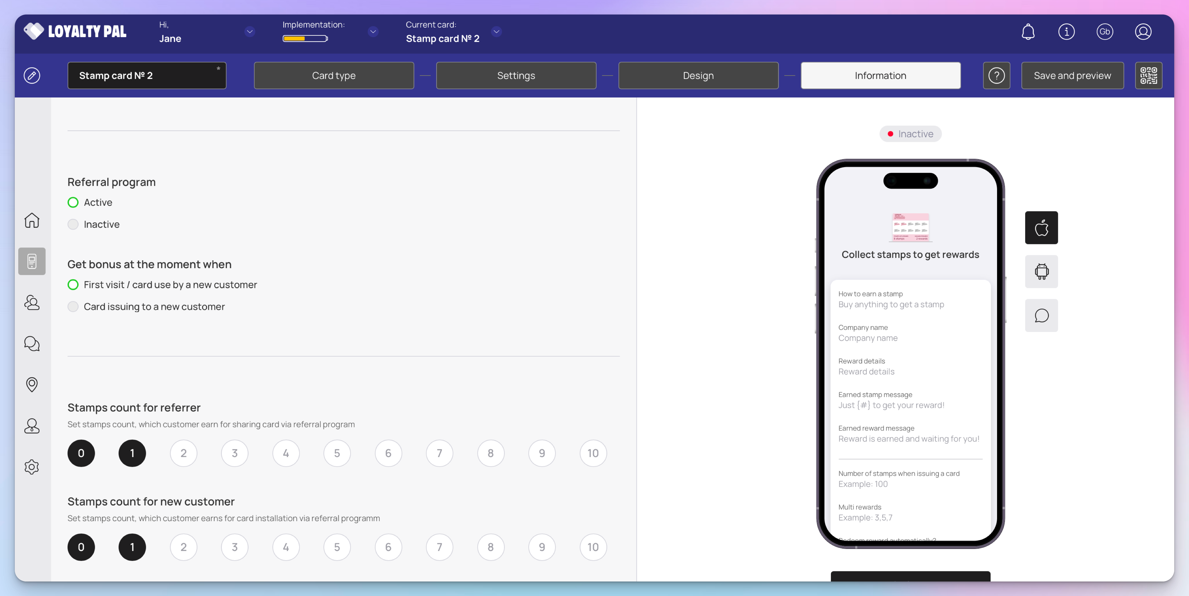 Stamp count for referrer: This is the number of bonus stamps the existing loyalty card holder will receive for recommending a friend.