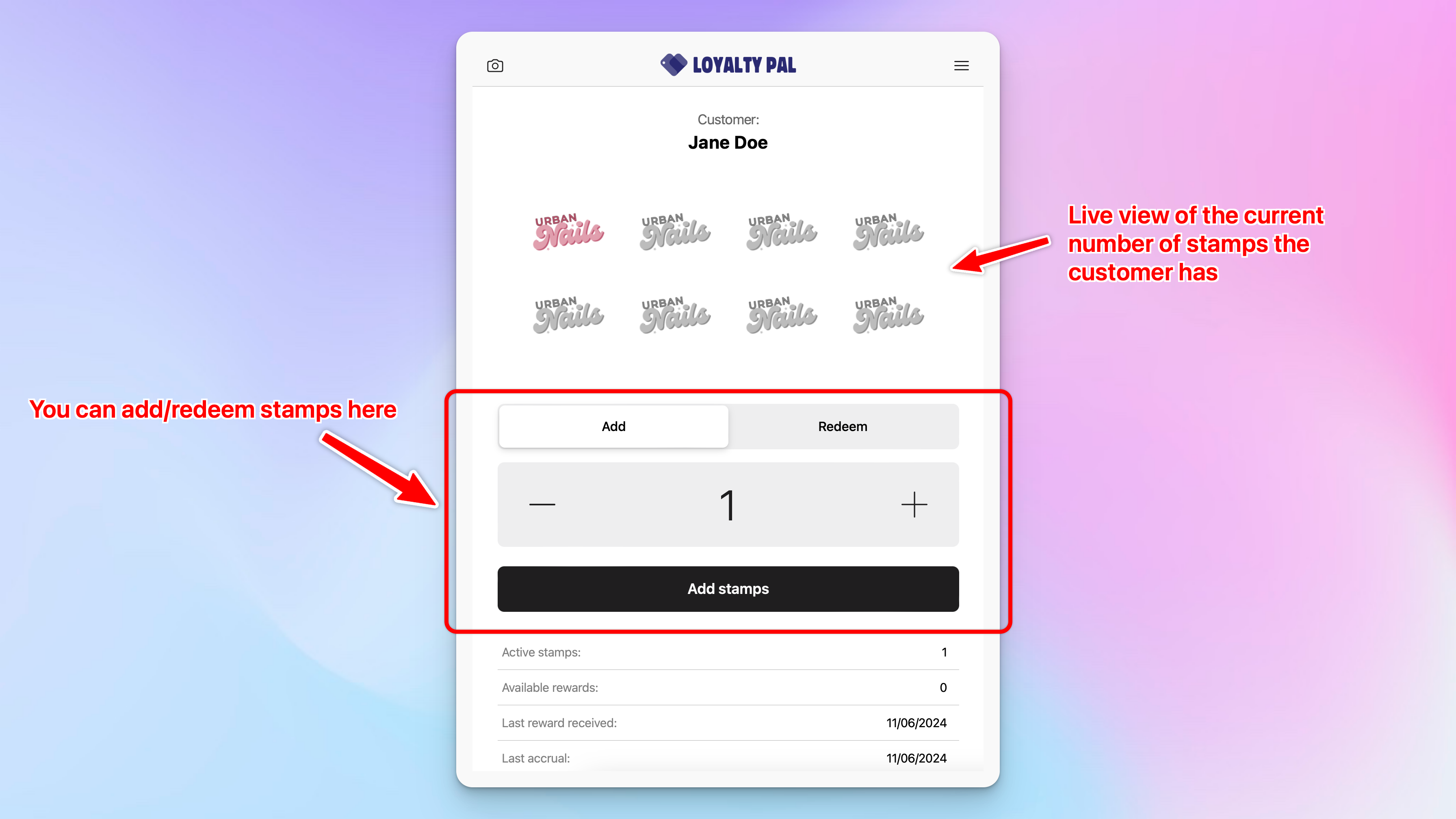 Redeeming Stamps: Switch to the 'redeem tab then use the + and - buttons to select the number of rewards to redeem then click 'redeem rewards'. (This is only be available once the customer has collected enough stamps to earn a reward).