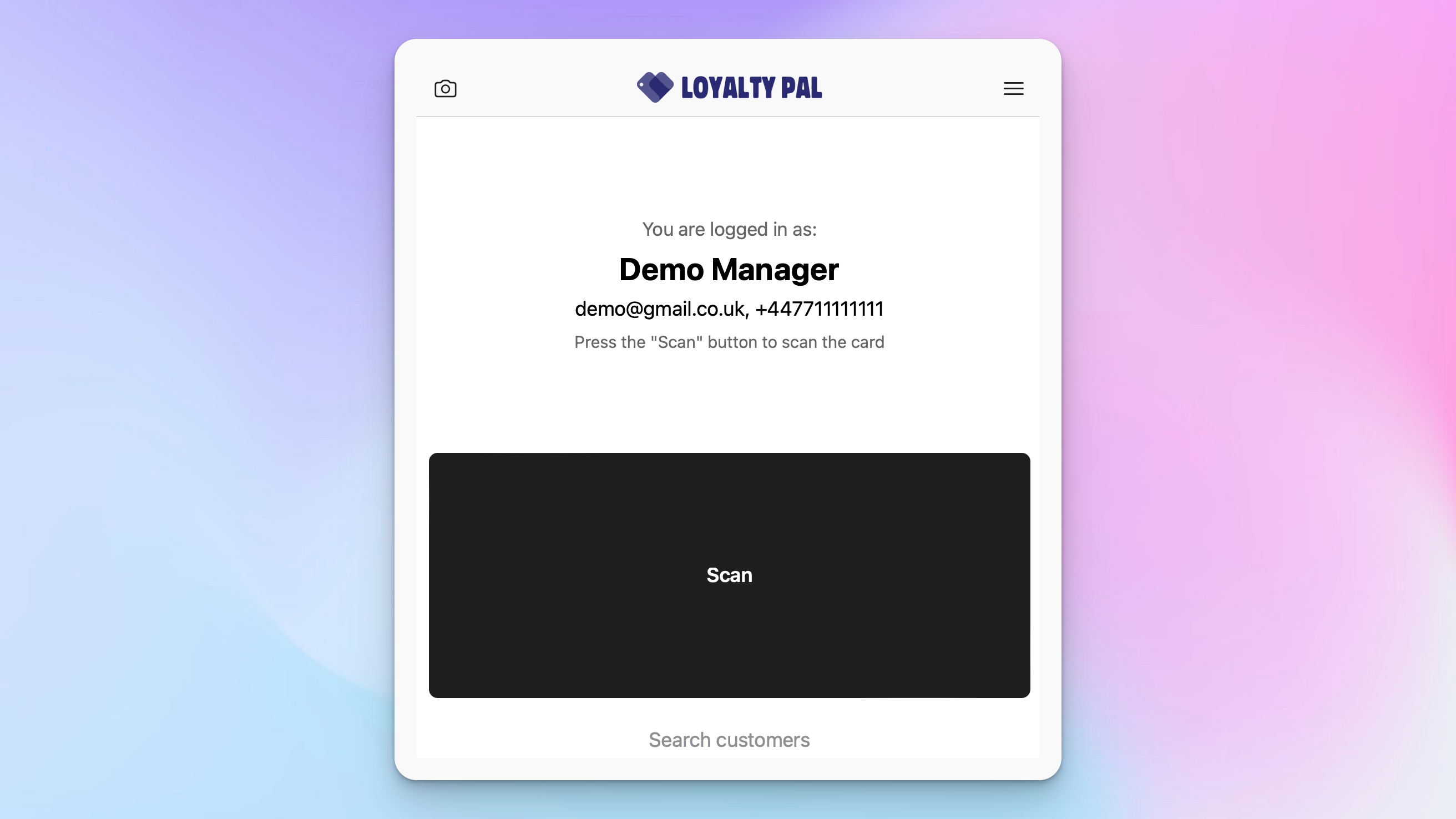 3. Click 'scan' the first time you do this you will need to allow the app to use your devices camera. You will then be able to scan the customers loyalty card.